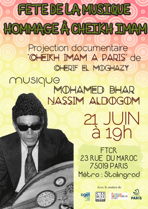 Depuis des années, la FTCR organise la Fête de la musique en hommage à un chantre de la liberté et de la justice :Cheik IMAM. Aujourd’hui, 7 juin c’est le 24ème anniversaire de sa disparition. Plusieurs générations de jeunes arabes s’identifient, au combat de ce musicien, accompagné par ses amis, Ahmed Foued NEJM, poète et Mohamed Ali, peintre.