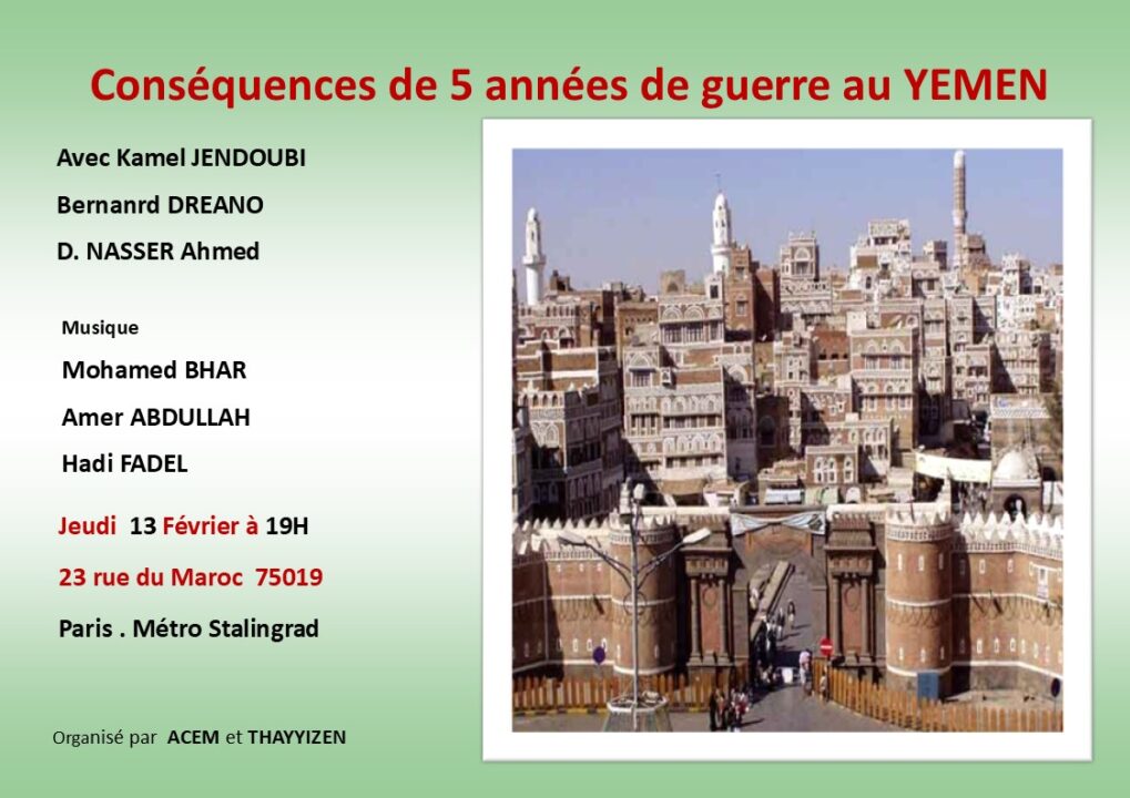 L’association ARTS ET CULTURES DES DEUX RIVES DU MONDE « ACEM » et l’association des yéménites en France « THAYYIZEN » vous invitent à une rencontre-débat autour de la situation dramatique au YEMEN.